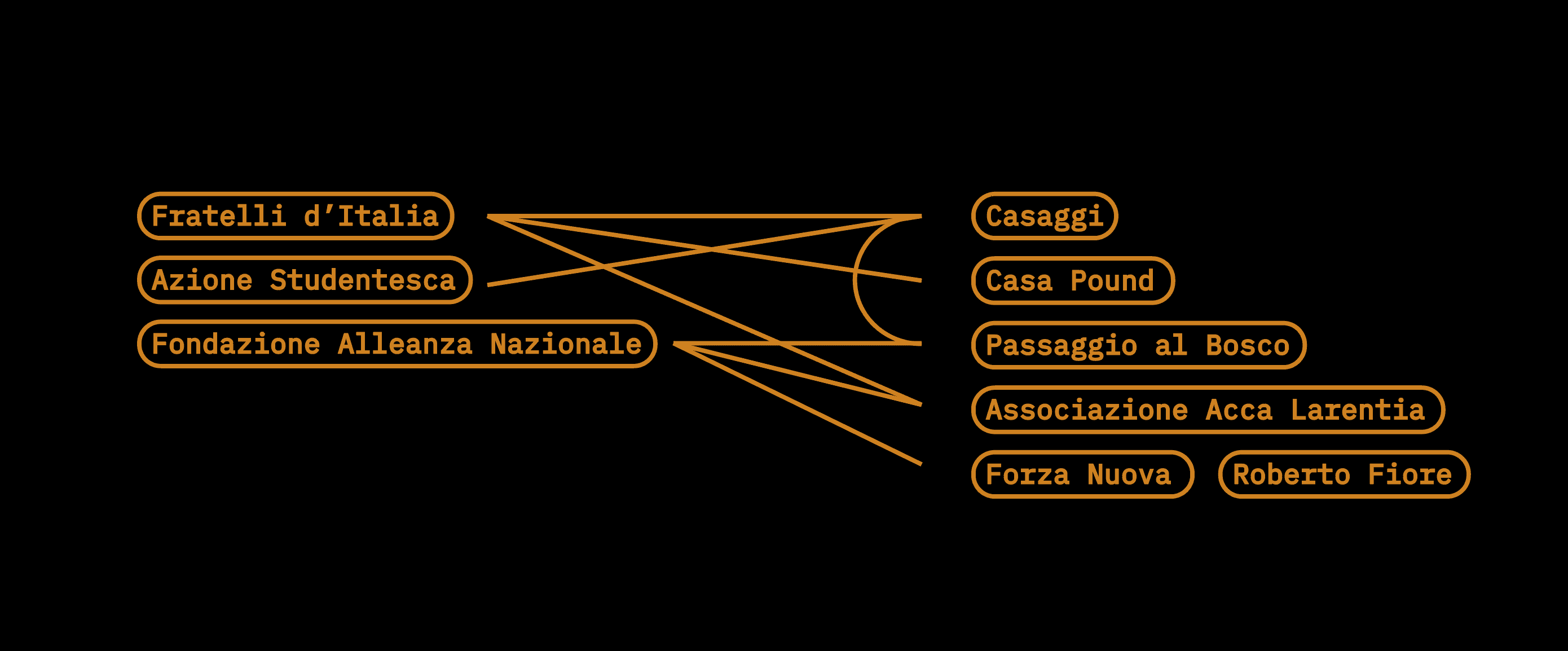 Passaggio al Bosco is also linked to the Fondazione Alleanza Nazionale, the financial arm of Fratelli d’Italia, of which Arianna Meloni is a member. The foundation has organised events promoting the publisher’s works, such as the book Siena s’è destra. Moreover, it has been associated with the Associazione Acca Larentia, to which it donated €30,00012, and with far-right and no-vax groups, including Roberto Fiore’s Forza Nuova, which received funding in 2021, when FdI was still in opposition but several of its members, including Ignazio La Russa, sat on the foundation’s board13.