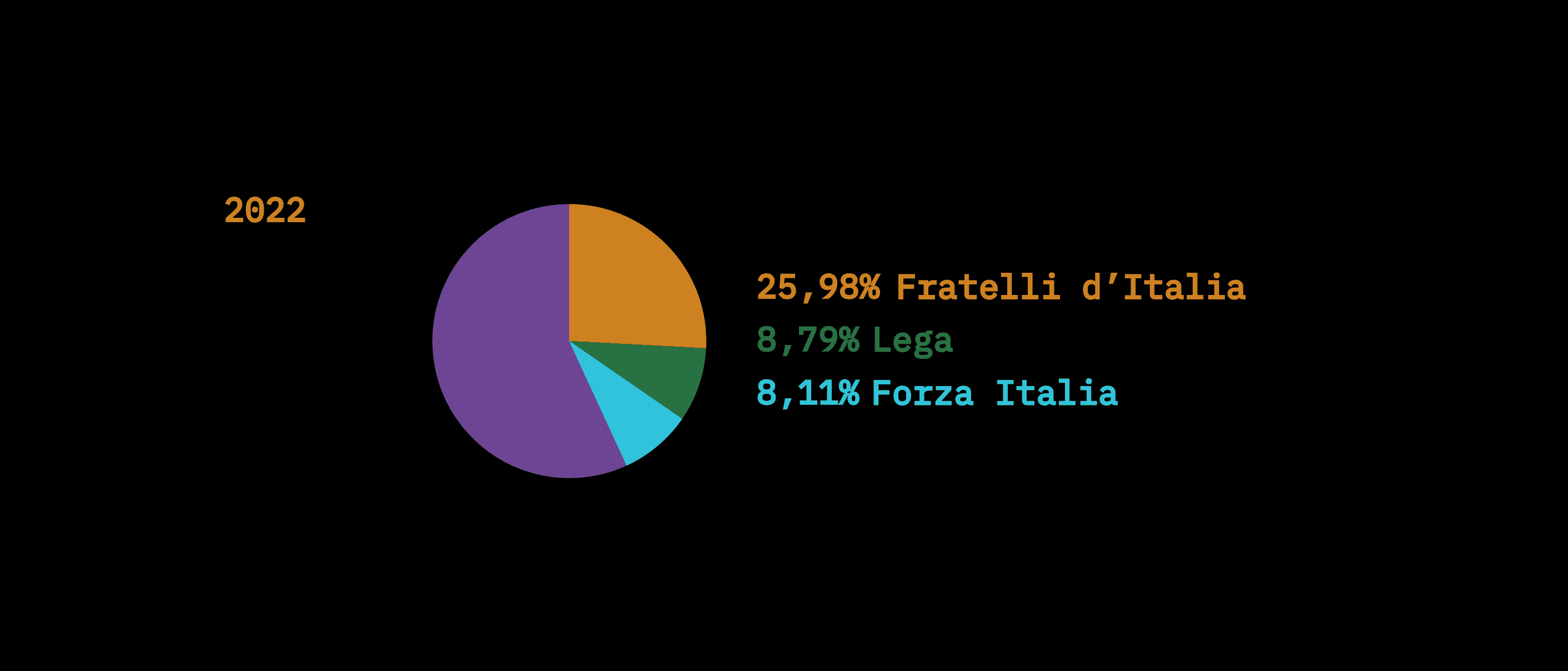 As stated earlier, the 2022 elections, which had the lowest turnout in the history of the Italian Republic, resulted in a right and far-right governing coalition with Fratelli d’Italia at almost 25,98%, Lega at 8,79% and Forza Italia at 8,11%.