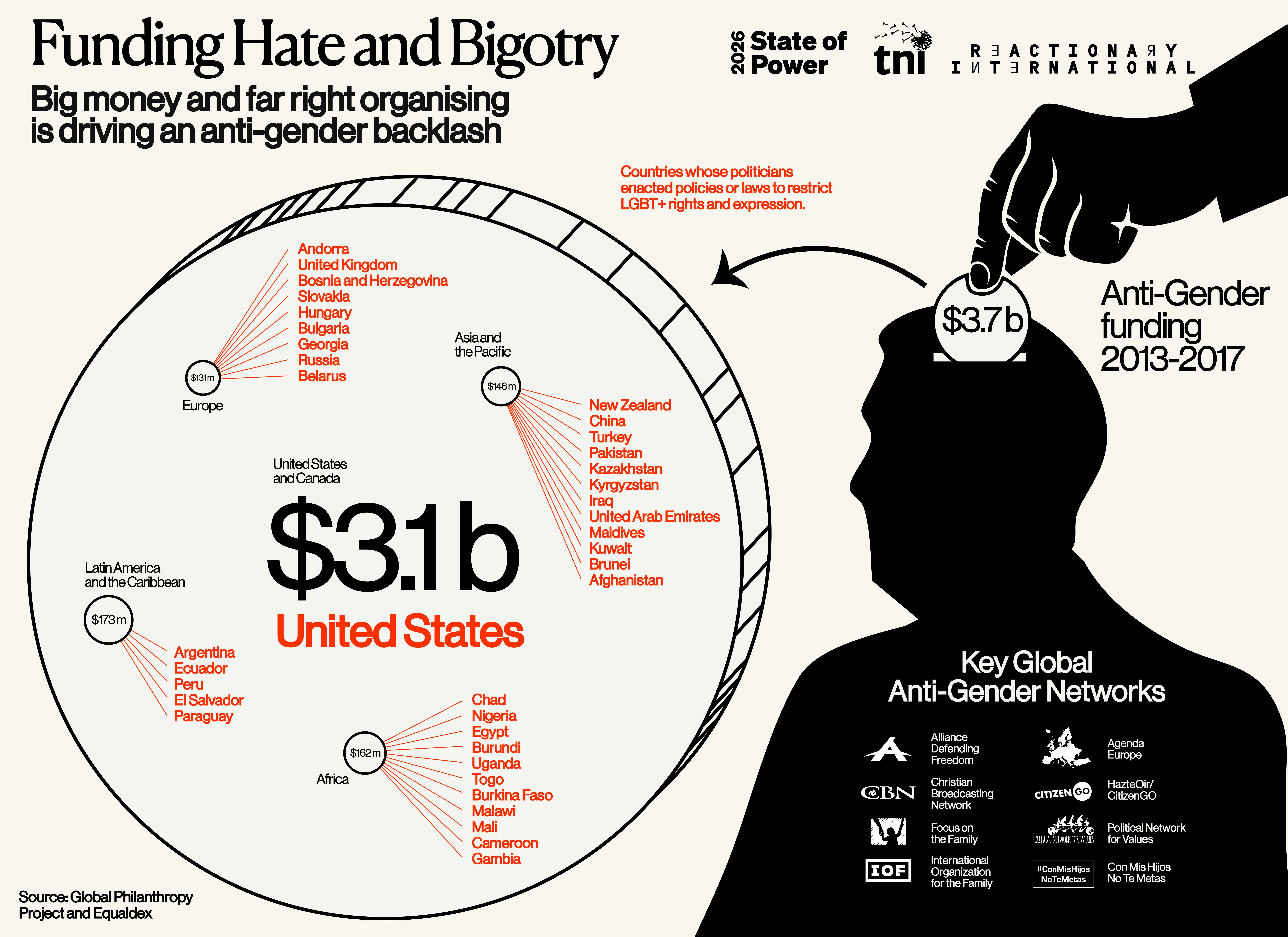 Well-funded transnational networks have channelled billions into campaigns opposing gender equality, LGBTQ+ rights and reproductive justice, weaponising these issues to secure support for broader far-right authoritarian agendas. Foundations, advocacy organisations and political groups coordinate across borders, financing media campaigns, litigation and lobbying designed to roll back rights and reshape public discourse.