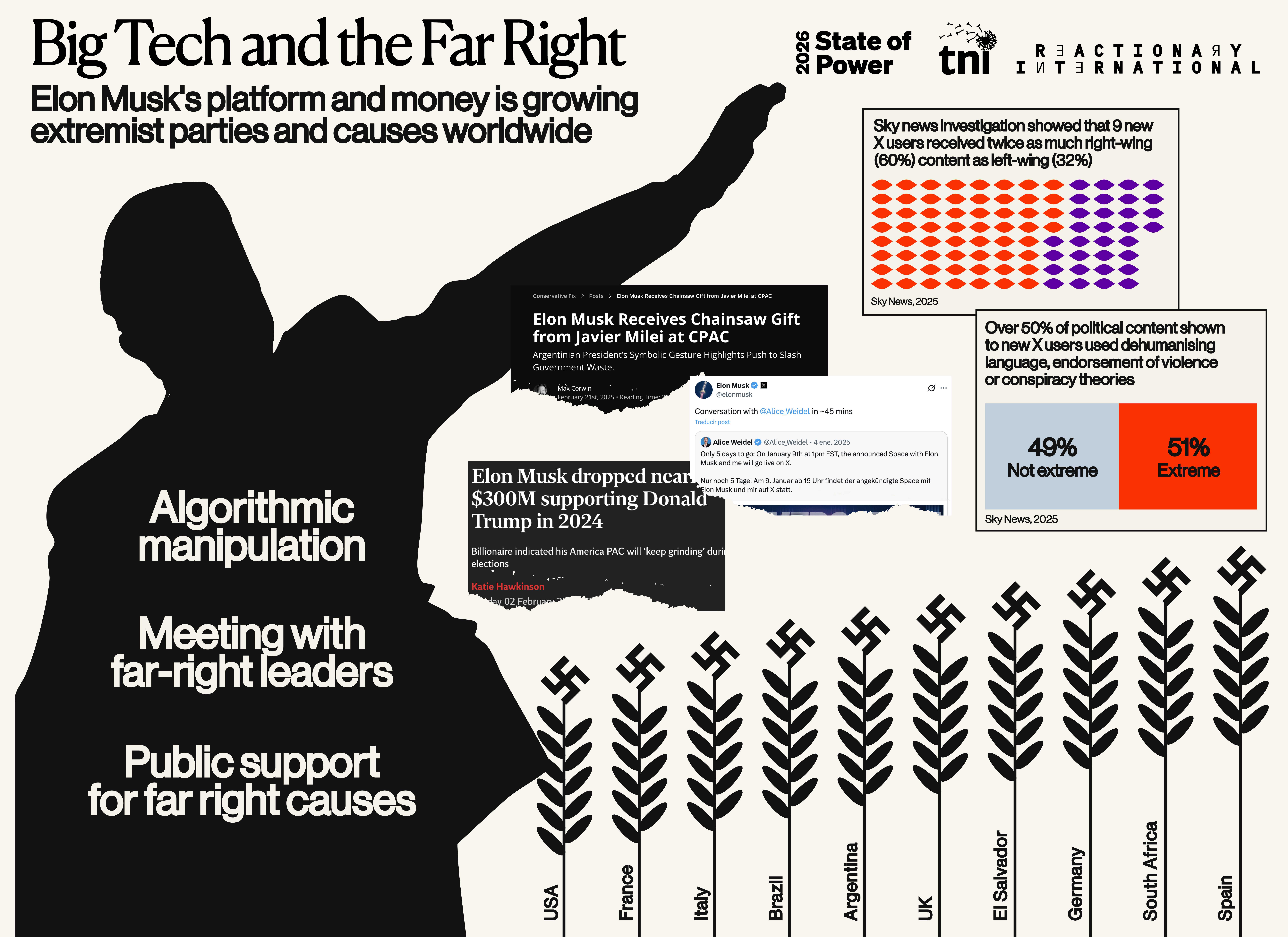 Elon Musk’s growing political role illustrates how concentrated private power in the tech sector is fuelling fascism. Through control of a major social media platform, amplification of far-right narratives and direct engagement with reactionary figures and movements, Musk has helped normalise extremist rhetoric and expand its reach. The case highlights how Big Tech is increasingly allying with the authoritarian right. This is a dangerous development as they are providing a communications platform that can amplify the far right's voices as well as supplying powerful coercive tools for surveillance and control.