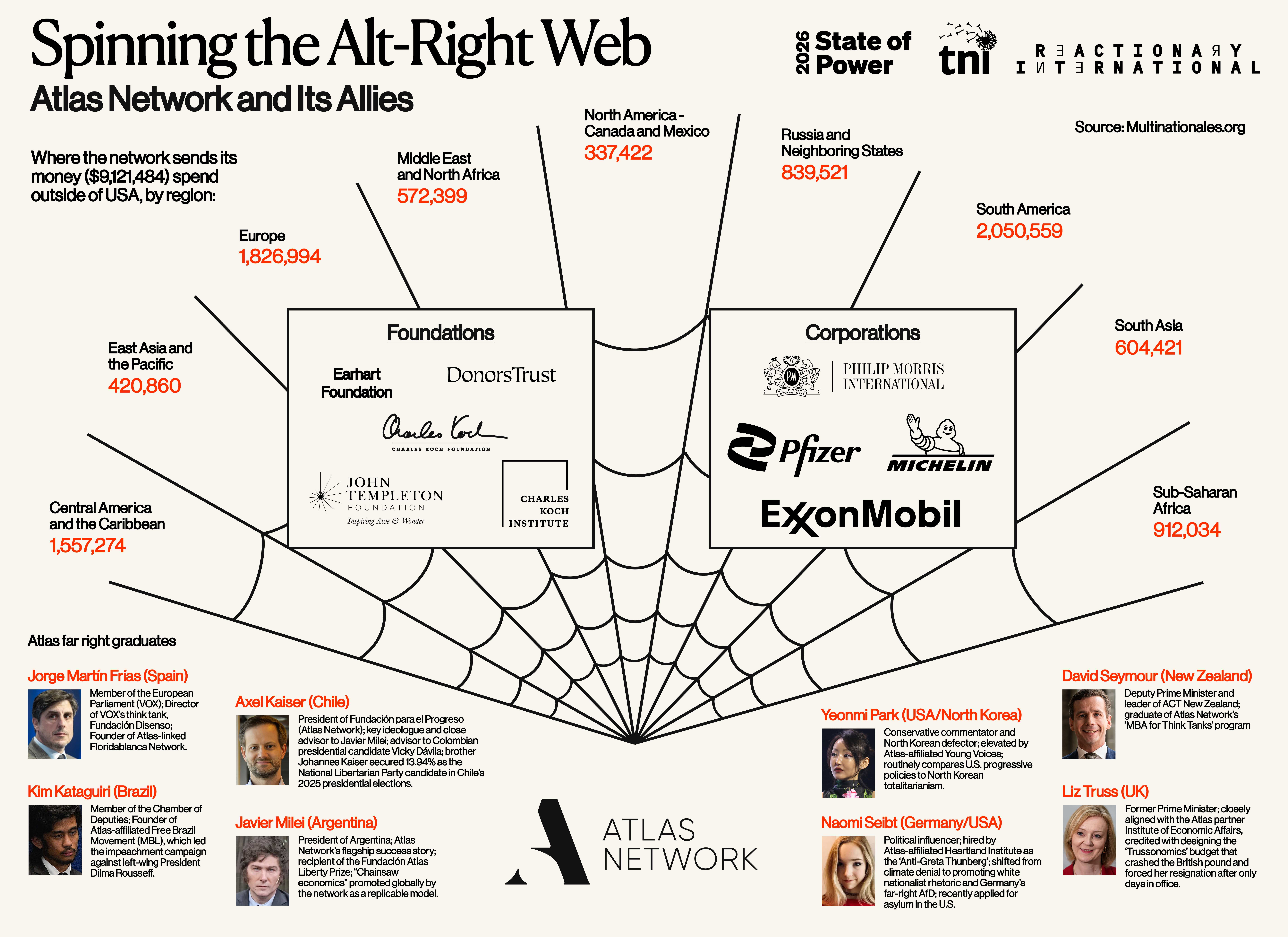 Think tanks, foundations and corporate donors form an extensive international infrastructure supporting free-market fundamentalism and nationalist politics. These networks train political leaders, shape policy agendas and coordinate messaging across continents, embedding far-right ideas within mainstream political and economic institutions and in the public debate. Atlas Network is one of the biggest networks of right-wing think tanks, and while it does not neatly map onto all the threads of the global far-right movement, it has been supported by and nurtured many of the far right's key organisations and figures.