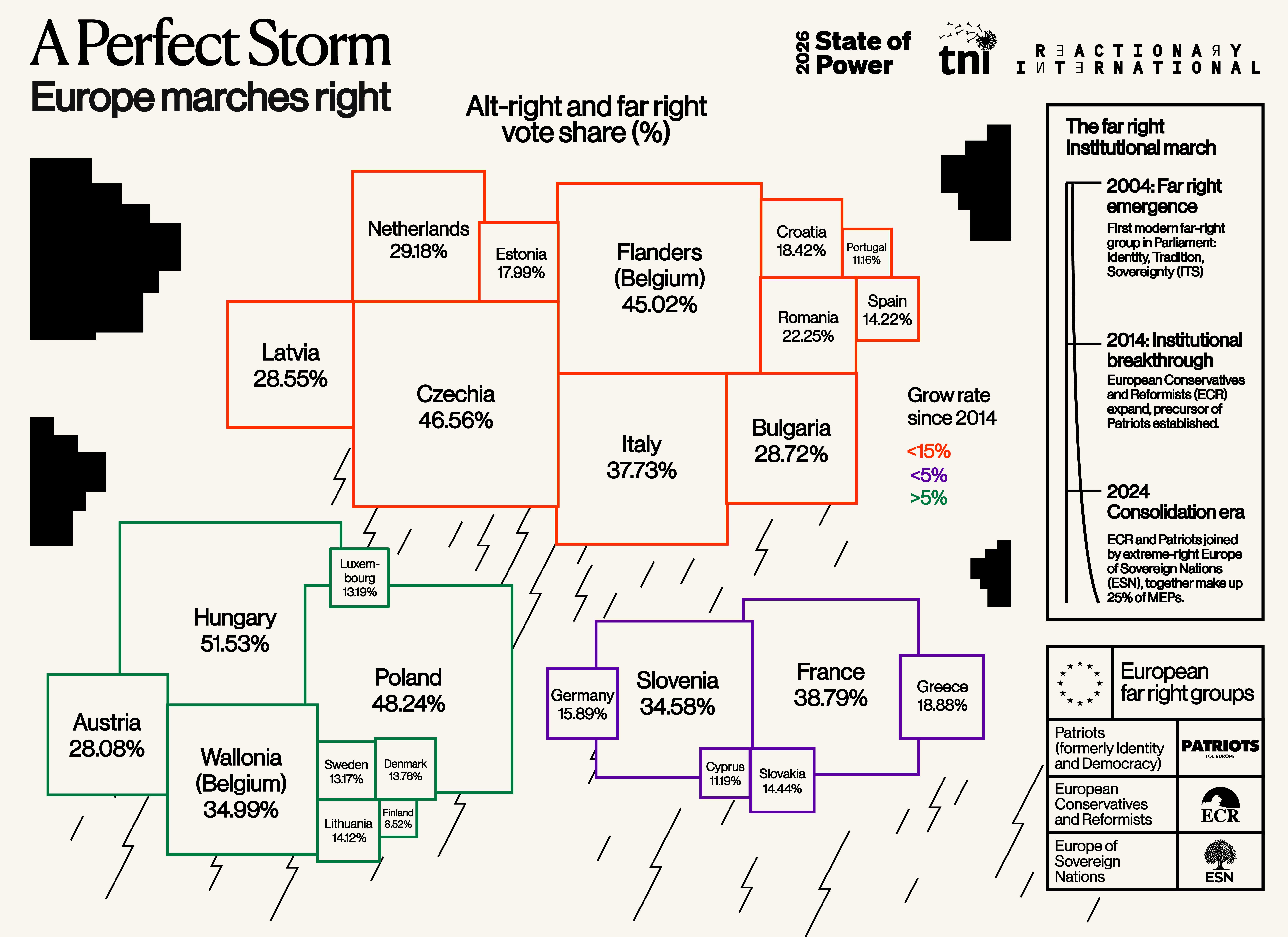 Electoral support for far-right and nationalist parties has grown across much of Europe over the past decade. In several countries, these parties now command large vote shares or hold governing power, while cooperation between parliamentary blocs has strengthened their influence at the European level. The trend reflects the failures of the European Union and its members to address the economic insecurity caused by the global economic crisis, the COVID pandemic, and the cost-of-living crisis.