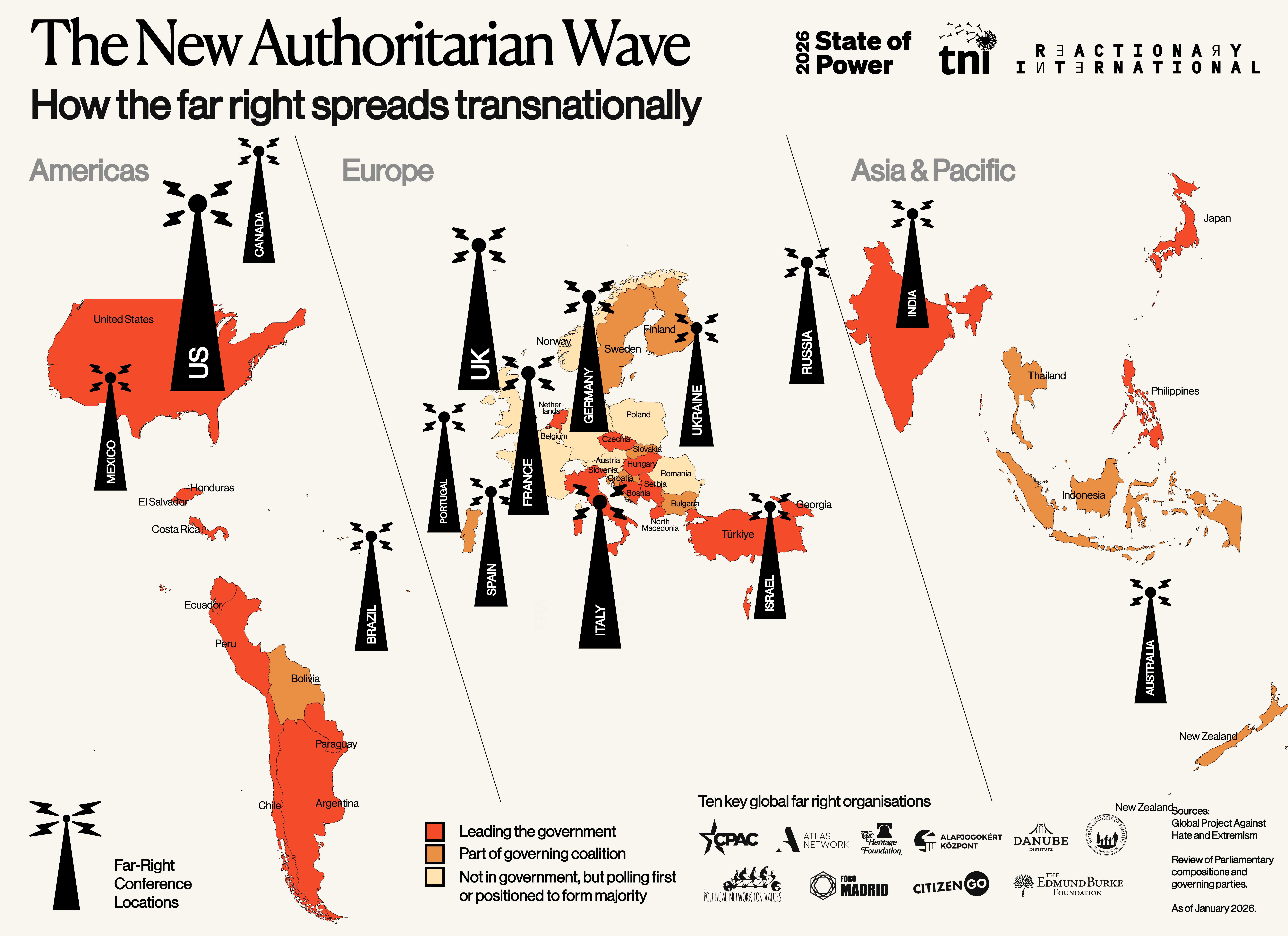 Far right and authoritarian forces have capitalised on global economic insecurity and political alienation to win elections. This map traces their electoral success, showing where far-right parties lead governments, shape ruling coalitions or are positioned to take power. It also tracks the main hubs and actors of transnational far right organising, represented here by the locations of transnational conferences and highlighting the key foundations and political networks that circulate funding, ideas and strategy. This has helped transform national movements into a coordinated global current.