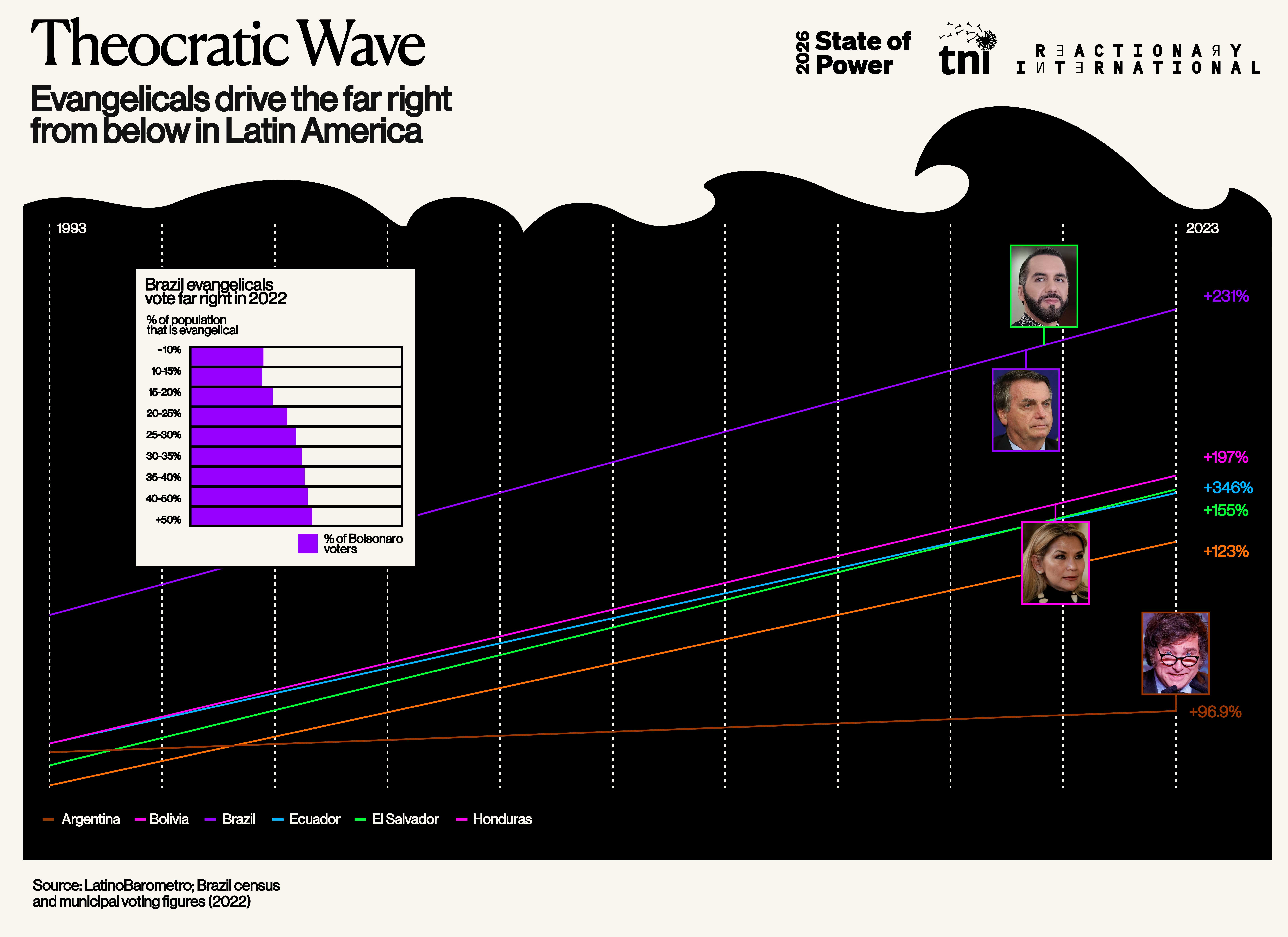 Religious movements, particularly evangelical and Pentecostal churches, have become significant political actors in parts of Latin America. Their expanding social influence has translated into electoral mobilisation, media presence and policy campaigns, often aligning with conservative and authoritarian agendas on gender and education.