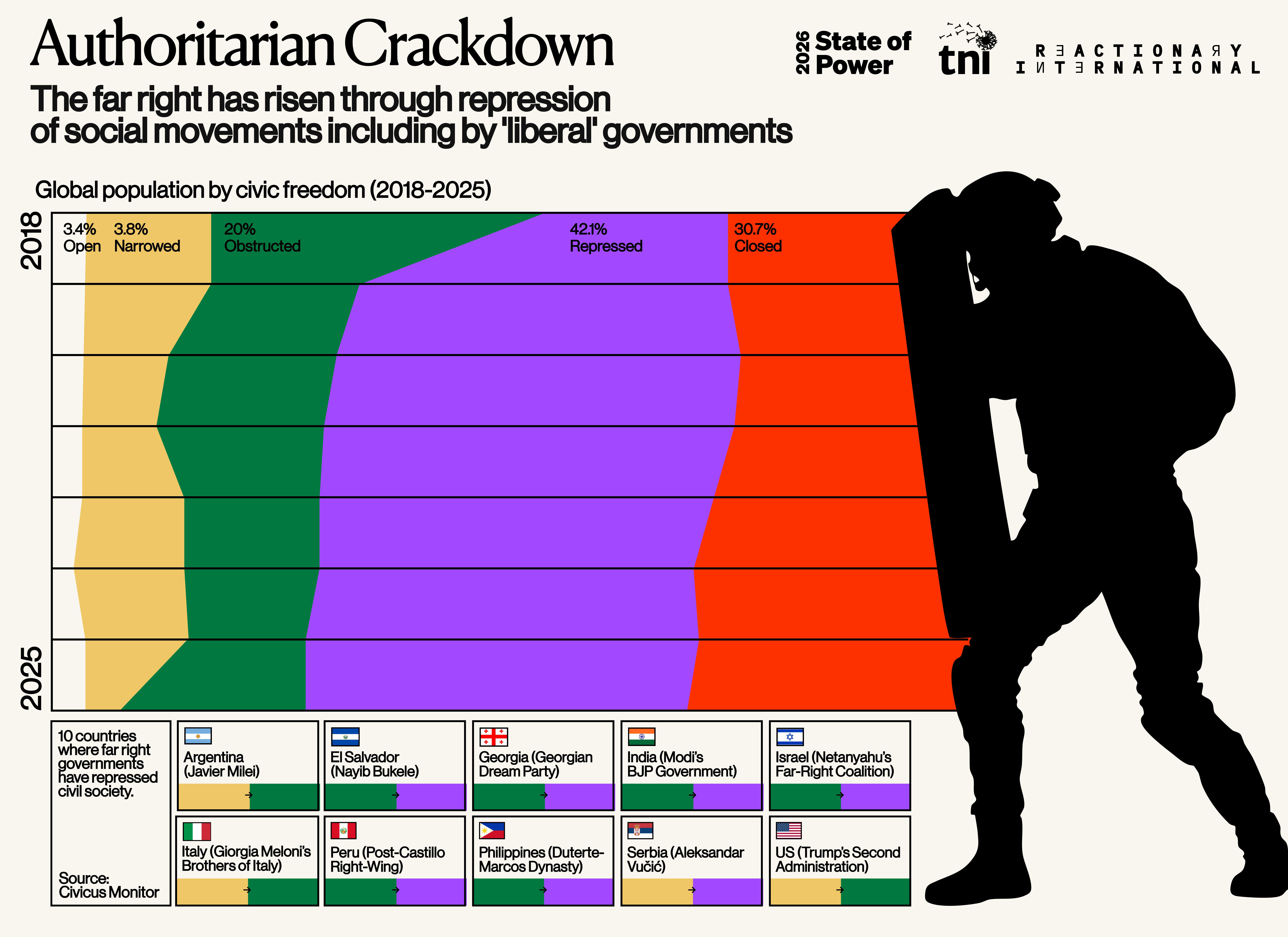 The rise of authoritarian and far-right governments has been facilitated by a growing repression of civil society, including by supposedly 'liberal' democratic governments. Once far-right parties come to power, the repression intensifies. Globally, protest movements, independent media, trade unions and human rights organisations have faced ever increasing surveillance, legal restrictions and criminalisation. A healthy democracy depends on an active civil society.